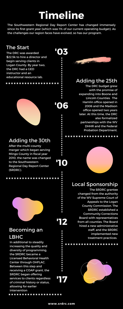 Mission: The Southwestern Regional Day Report Center exists to ensure everyone affected by substance use disorder in the southwestern region of West Virginia–Boone County, Lincoln County, Logan County, and Mingo County–has a fighting chance at recovery, especially those impacted by the criminal justice system.